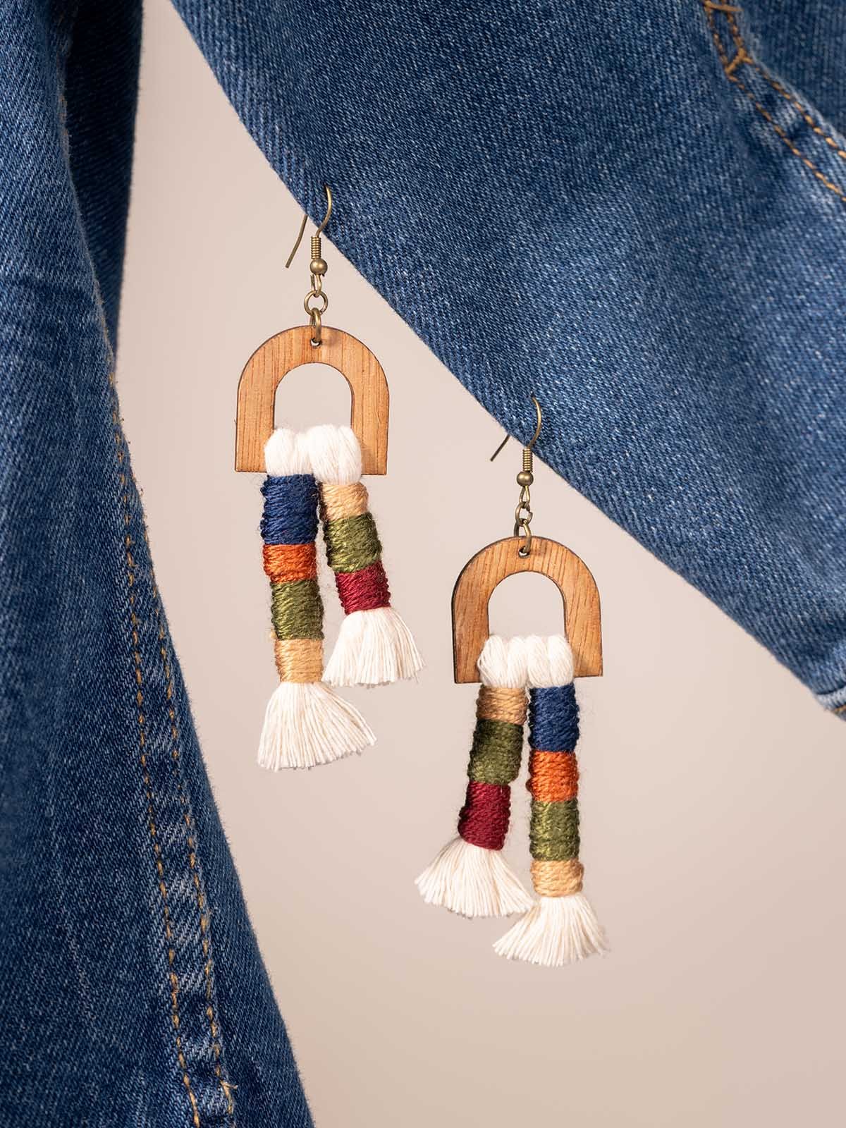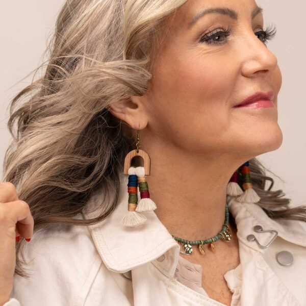 We love the playful movement and charm of the Colorful Tassel & Wood Earrings. These lightweight statement earrings feature wood arches paired with soft white thread tassels. accented by wrapped bands of navy blue. mustard yellow. dark green. and burgundy. The mix of natural texture and rich color creates a relaxed. boho-chic style that’s easy to wear and full of personality.